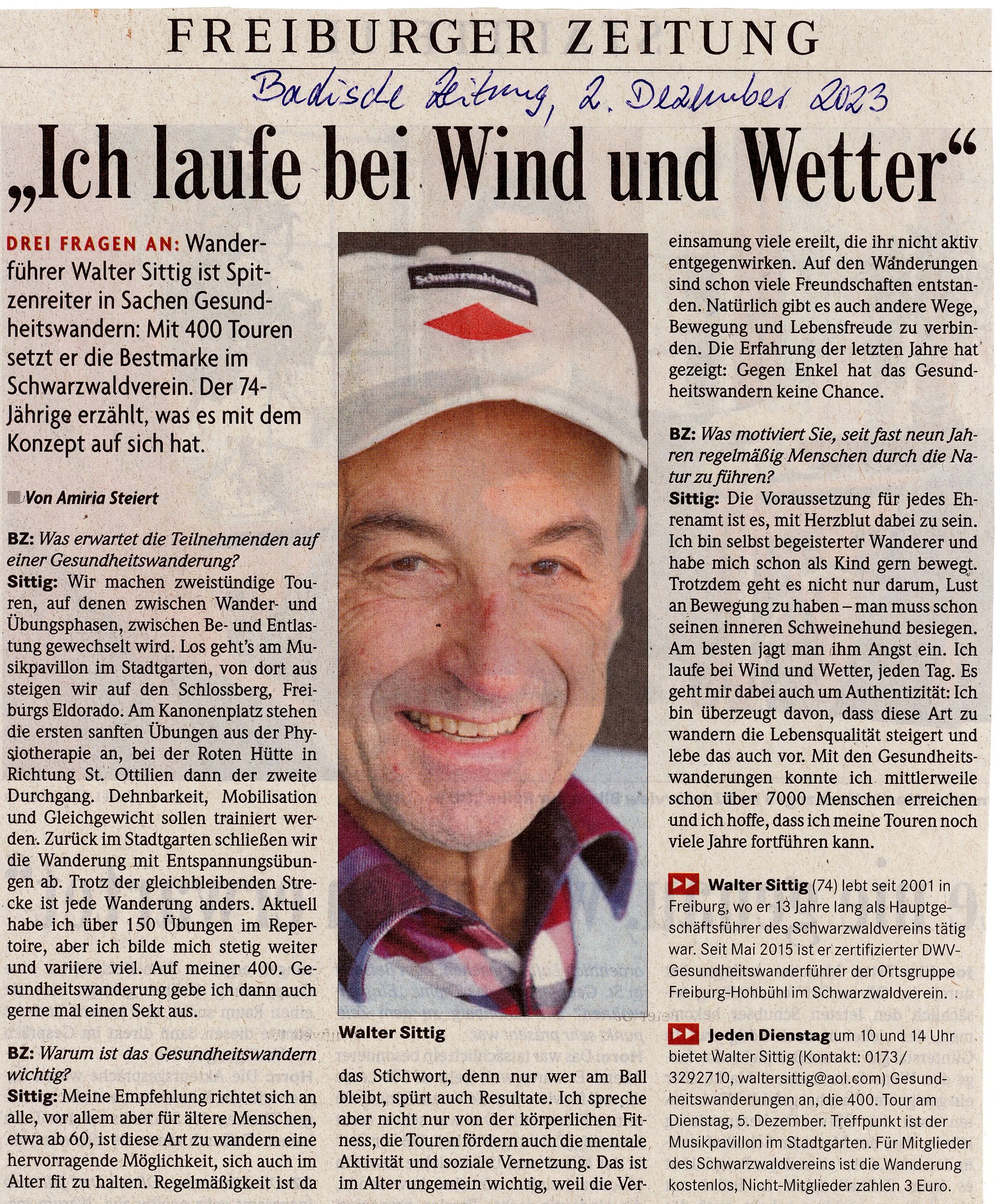 Gesundheitswanderung für alle Altersgruppen mit ausgewählten Übungen die fit machen. Gehzeit: 1,5 bis 2 Stunden Kosten: Mitglieder frei- Nichtmitglieder 3€ Interview der BZ mit Walter Sittig zur Gesundheitwanderung. |