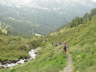 schmale Pfad aufwärts am rauschenden Gebirgsbach entlang,
