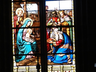 farbigen Glasfenster setzen schöne Akzente in der schlichten Kirche.