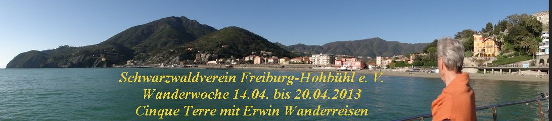 Besuch des kleinen Ortes Riomaggiore. Unser Pfad führt hinauf zur Wallfahrtskirche Madonna di Monte Nero . Wir genießen eine traumhafte Aussicht über die Dörfer der Cinque Terre und auf die levantinische Küstenregion. Weiter führt der Weg über einen Höhenrücken mit dem kleinen Ort Campiglia. Ein spektakulärer Küstenweg mit fantastischen Ausblicken ins Hinterland, La Spezia und die Insel Palmeria bringt uns hinunter ins Hafenstädtchen Portovenere. Nach dem Bummel durch die Altstadt, Rückfahrt mit dem Schiff entlang der 5 Dörfer nach Lavanjto. An - und Rückfahrt mit der Bahn. Gehzeit 5 Std., 539 Hm, auf und ab.