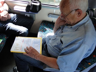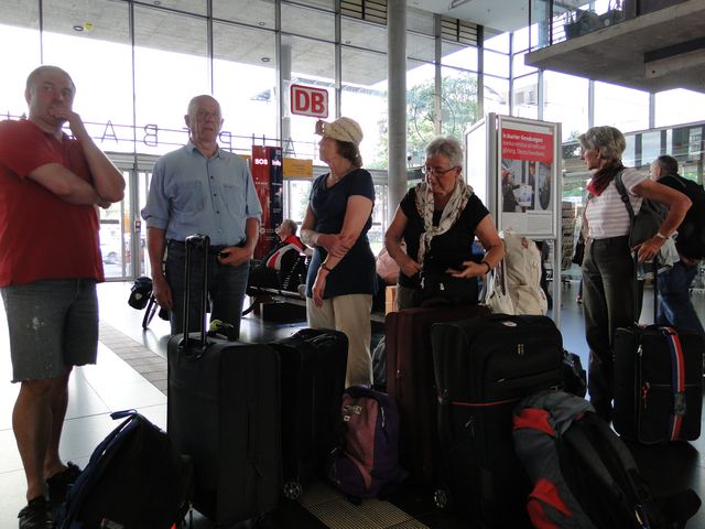 Der häufig verspätete Zug war mal pünktlich, denn zitter, bibber, in Karlsruhe sind gerade mal 8 Minuten zum Umsteigen. Hat geklappt. Otto hat einen Sondertarif für die 1. Klasse ergattert und so reisen wir wahrhaft fürstlich. Durch weit geschwungene Hügel gings durchs Schwabenland, das dann doch zunehmend häuslebauerisch dicht wurde. Ab Stuttgart schleicht es sich die Alb hoch und kommt mit einer guten Verspätung schließlich in München an. Da steht er, der fremdländische Koloss mit nur 1 Schlafwagen. Einlass gibt es nur durch einen mürrischen Schaffner. Mit ungarischem Akzent weißt er uns die Dreierabteile an. Ich komme mir vor wie in der Operette „Jo, mein idealer Lebenszweck ist Borstenvieh und Schweinespeck.“ Dora will ins obere Bett, Dorothea kann nur unten schlafen