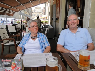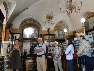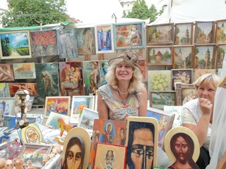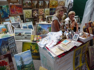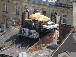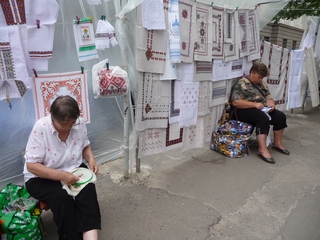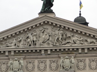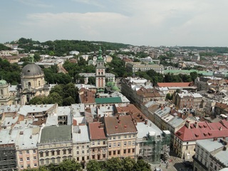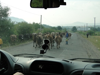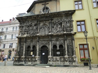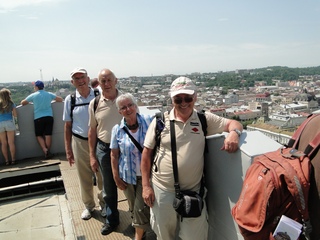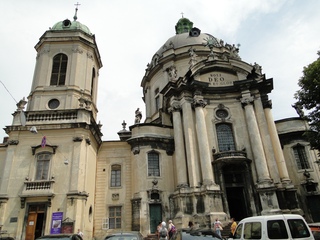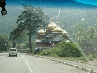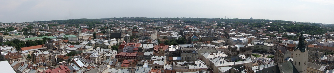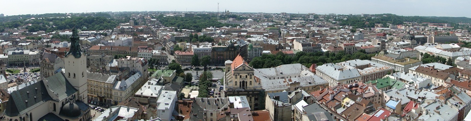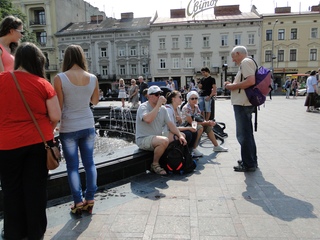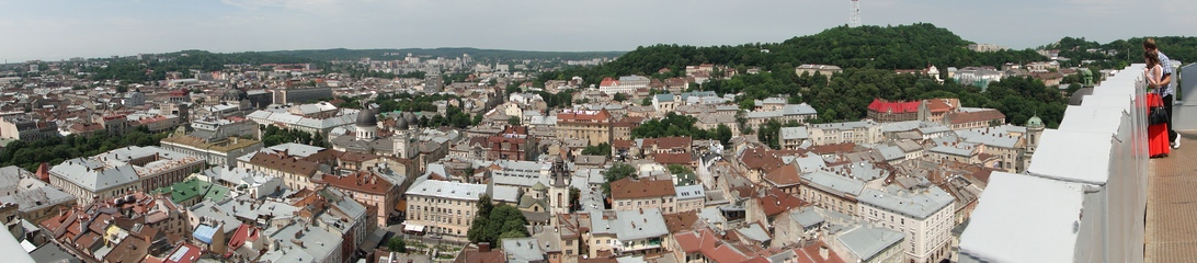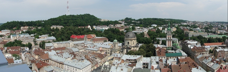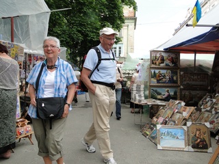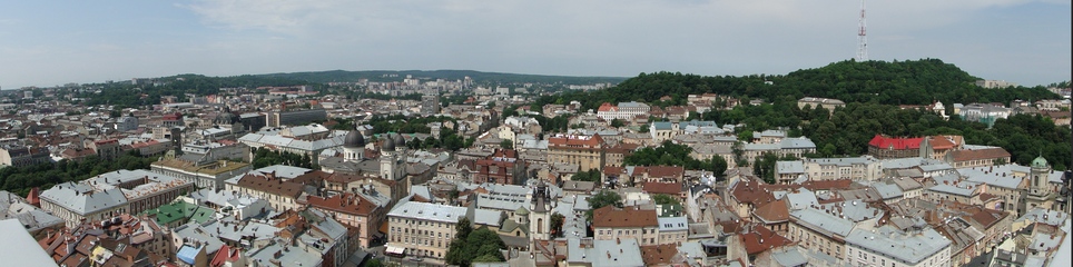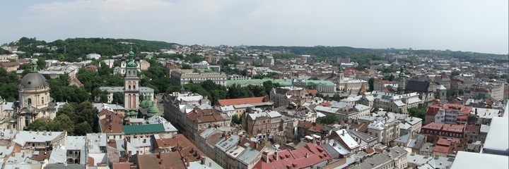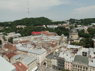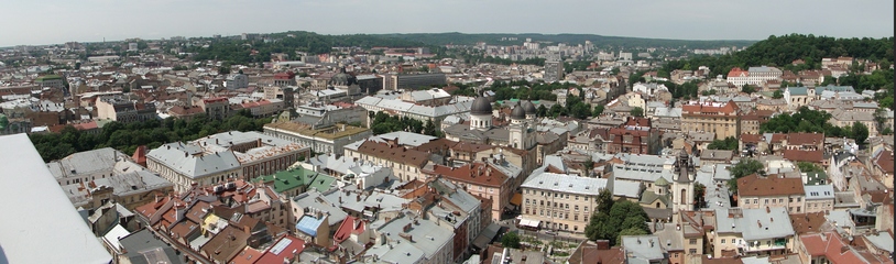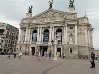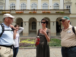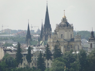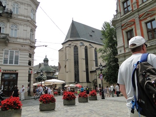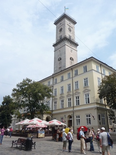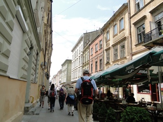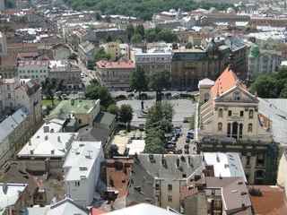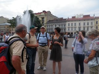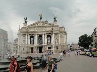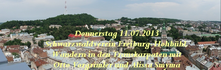 Um halb acht am Morgen starten wir nach Lemberg. Es ist viel weiter weg als ich dachte. Eine gute Stunde lang (-sam) geht es in geschickten Schlangenlinien über Schlaglöcher. Durch enge Buchenwaldtäler. Dann endlich kommt Autobahn. Sie zieht sich an der Bahnlinie Uzhgorod – Lviv entlang. Das Land weitet sich zum offenen Hügelland. Einige Kilometer sehen wir ehemalige deutsche Dörfer mit strohgedeckten Satteldächern. Bunt bemalte Holzhäuser ducken sich ins Tal. (siehe Feliziental) Der Autobahnverkehr hält sich erfreulich in Grenzen. Lkw-Schlangen kennt man hier wohl nicht. Was auch fehlt sind die goldenen Kornfelder. Was aussieht wie endloses Brachland stellt sich aber als noch nicht gemähte Wiesen heraus. Die Fahrt eignet sich gut für Leseübungen. Die Ortsschilder sind mit lateinischen Buchstaben untertitelt. Die bekannte Worte Lviv und Chop und auch Kiew kann ich gut lesen. Rätsel geben große, weiße Überlandleitungsrohre auf. Ist es Gas? War das nicht unlängst ein Politikum weil die Russen plötzlich Weltmarktpreise verlangten und daraufhin die Ukrainer die Leitungen klammheimlich anzapften? Nach gut vier Stunden Fahrt für die 285 Km erreichen wir die Stadt und - bei uns undenkbar, kann uns Vitali (Alissas Mann) direkt am Opernplatz ausladen. Unsere Guide Juliana erwartet uns bereits. Erst bekommen wir einen satten geschichtlichen Abriss der Stadt, der üblicherweise leider schon an der nächsten Ecke vergessen ist. Die Stadt hat Herrscher aus allen umliegenden Ländern gehabt. Dann schleppt sie uns durch Kirchen. Dort erklärt sie uns jedes Herrgöttle. Ist ja nicht uninteressant aber das geht auf Kosten der übrigen Stadtführungszeit. Das ist schade, denn ich sehe nur prächtige Häuser, die fast alle im besten Zustand sind. Da ließe sich sicher einiges darüber erzählen. Doch - die Oper, diesen Prachtbau bekamen wir detailliert. Ebenso den mit Bäumen gesäumten Prospekt Svobody und wirklich beeindruckend fand ich die armenische Kirche, die sie uns als Letzte zeigte. Gerade als wir eintraten trat ein Mann in die Kirchenmitte und rührte mit einem innig vorgetragenen Choral mit seiner wunderbaren Stimme unsere Herzen an. 1971 in Kiew konnte ich in einer orthodoxen Kirche die Verspers von Rachmaninow hören. Das habe ich heute noch im Ohr. Das Rathaus stammt aus jüngerer Zeit. Manfred, Hubert und ich machten uns an die Besteigung des Rathausturms – der tollen Aussicht wegen. Gefühlte 800 aber in Wirklichkeit natürlich nur 500 Holztreppen. Belohnung – Blick auf die ganze Stadt. Sie ist umringt von bewaldeten Hügeln. Die Stadt möchte ich nicht näher beschreiben. Das kann jeder Reiseprospekt besser. Auf der Heimfahrt kamen wir in Starkregen. So vermied es Vitali noch einmal über den Schweizer Käse zu fahren und nahm den kleinen Umweg auf bester Straße über Uzhgorod. Was mir so auffällt bei der Fahrt übers Land ist, dass die Kirche sichtlich wieder bestens Fuß gefasst hat. In jedem Dorf glänzt die goldene Kuppel. Um halb zehn kamen wir zu Halina, die uns doch tatsächlich