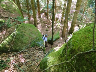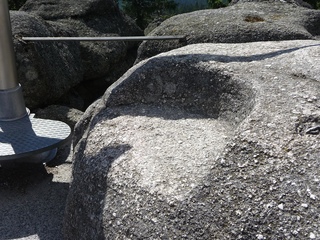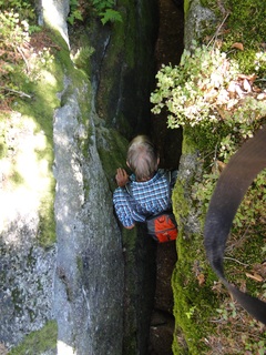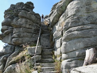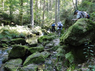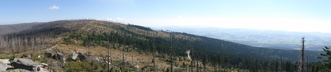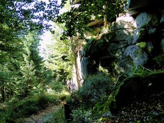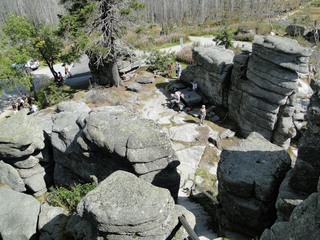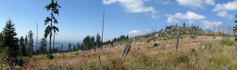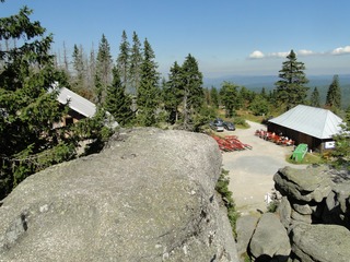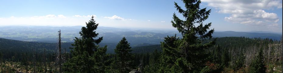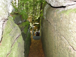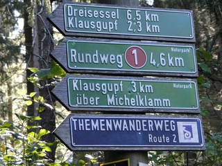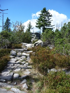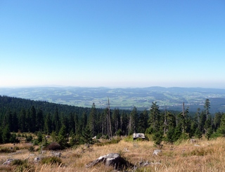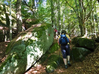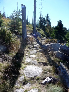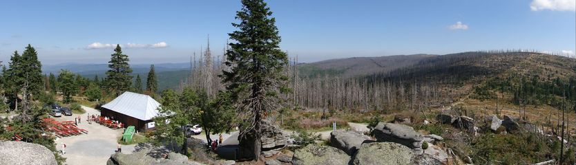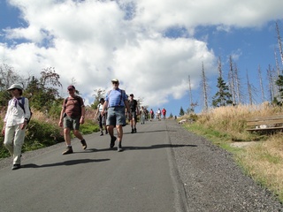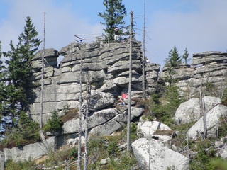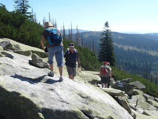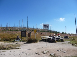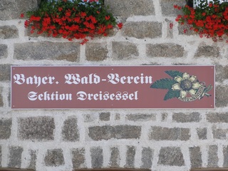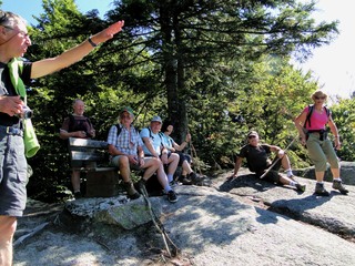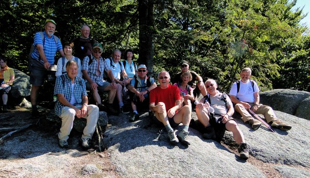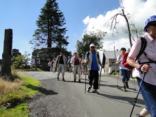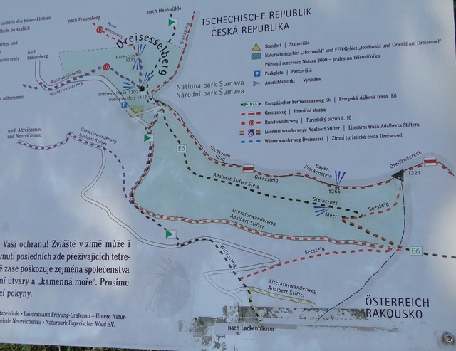 und wieder ein strahlender Himmel. Unser Ziel ist heute das Dreiländereck mit den Dreisesseln. Unsere „Bersteiger“, immerhin die Hälfte unserer Gruppe, durften in Altreichenau aussteigen um über 600 Hm den Gipfel des Dreisessel zu erklimmen. Wir dagegen wurden zum Parkplatz unter dem Gipfelgasthaus gefahren. Eigentlich wollte ich mir mit einigen anderen den angebotenen Spaziergängerweg als Ruhetag gönnen doch Manfred hatte mir schon gestern Abend die 2 ½ Stundentour mit dem Steinernen Meer zur Führung aufs Auge gedrückt. Der hiesige Wanderführer war im Urlaub. Na denn….! Keine Wanderkarte, keine Ahnung vom Gelände, kein Internet für Infos. Aber Manfred hatte mir eine Wegeschreibung ausgedruckt, doch sicherheitshalber fragte ich noch unseren Busfahrer. Obendrein konnte ich eine Karte auf einer Infotafel fotografieren. Letztendlich war das mein Glück. Schon die erste (richtige) Abzweigung übergingen die Vorrausrenner, folgten der Beschreibung des Fahrers und waren nicht mehr gesehen. Na ja .. ich ging nach Manfreds Spickzettel mit bester Beschreibung. Nur – was uns sechs Übriggebliebene erwartete, ahnte keiner. Oh, waren die Wege der Cinque Terre einfach! Der Adalbert Stifter Steig zieht sich ein paar hundert Meter unter dem oberen Grenzkammweg am steil abfallenden Südhang entlang. Hier ging es nur über mehr oder weniger große Steinbrocken und Felsblöcke mit tiefen Spalten dazwischen. An gleichmäßige Wanderschritte war nicht zu denken. Hohe Stufen wäre ich auf dem Hintern runter hätte ich meine Stöcke nicht gehabt. Gottlob hatte sich ein einsamer Wanderer zu uns gesellt, der zum einen ein GPS und zum anderen ein hilfreiches Händchen hatte, wenn es zu haarig wurde. Entschädigt aber wurden wir durch eine einmalige Aussicht. Es