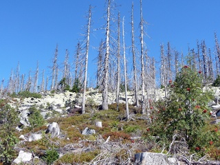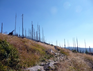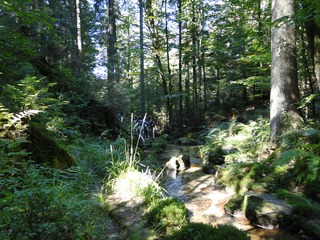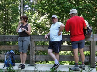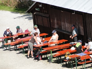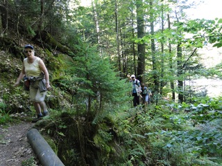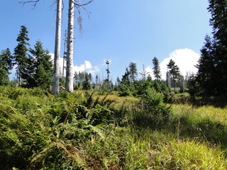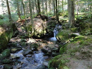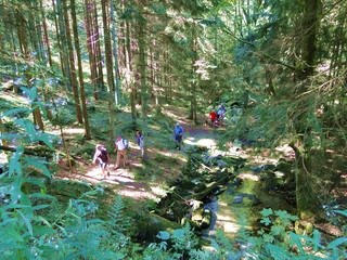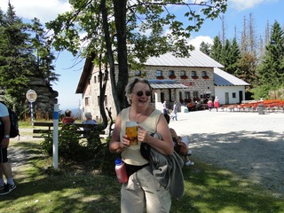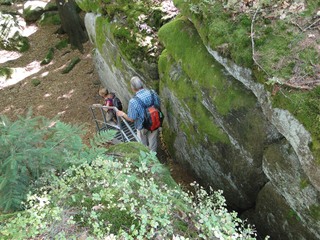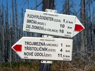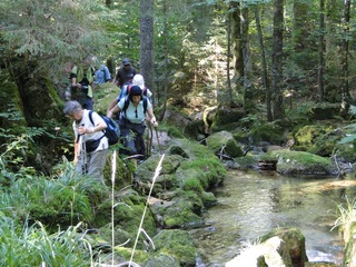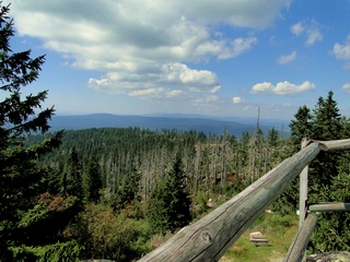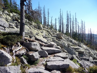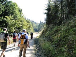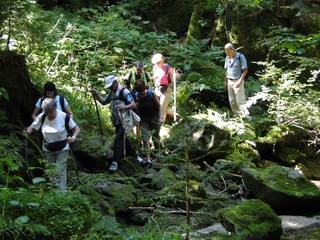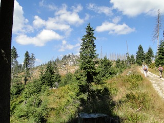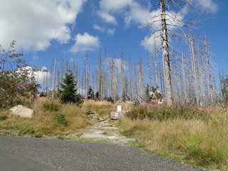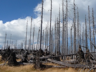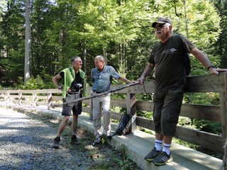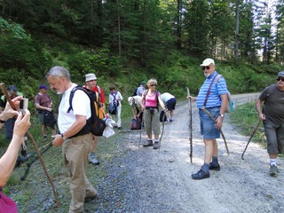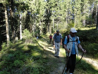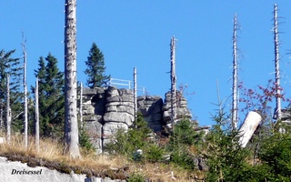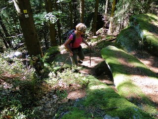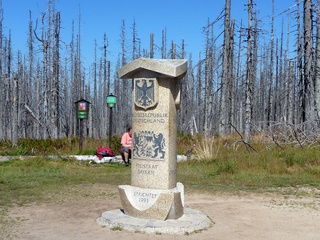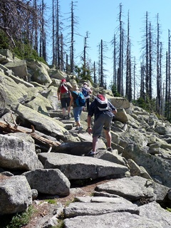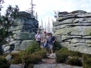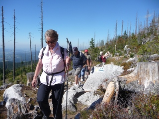 Aberwitzig recken sich hangaufwärts die rindenlosen, bleichen toten Stämme des Borkenkäferfrasses in den Himmel. Die Äste stehen wie Stacheln ab. Am Boden dagegen blüht und grünt es munter. Büsche, Farne und schon kleine Fichten und Ebereschen. Die Wegmarkierung war vorbildlich und endlich – ich dachte schon ich wäre verkehrt gegangen, erschien über uns am Hang ein Durcheinander von grünen Granitbrocken, das Steinerne Meer. In der Eiszeit haben Sonne und Frost im Wechsel von Tag und Nacht riesige Steinblöcke geschaffen, die nun wild zusammengewürfelt sind. Wenig weiter kam ein zweites Feld und beim dritten ging’s dann voll zur Sache. Es mußte überquert werden.. Der Wanderweg war fast nicht erkennbar. Schräg abfallende Granitblöcke waren zu überwinden. Nur manche Steine waren zu einem begehbaren Weg von Menschenhand zusammen gefügt. Hätte ich die ganze Gruppe von über 15 Leuten darüber führen müssen hätte ich wahrscheinlich Blut geschwitzt. Über den Seesteig gelangten wir dann zur Dreiländermark. Tschechien, Österreich und Deutschland geben sich hier die Hand. Lebhafter Betrieb war auf diesem offenen Platz und wir gönnten uns eine wohlverdiente lange Pause. Für den „technischen Halt“ konnte man sich ein Land aussuchen – ich wählte Österreich, denn in Tschechien war Totholzdickicht. Ist es nicht toll, dass es niemanden mehr kümmert, in welches der drei Länder wir jetzt gehen wollen!! Viel zu lange Zeit war das nicht möglich. Der „Grenzweg“ zum Dreisessel wurde uns als breit und einfach beschrieben, aber ach, er war die Kleinausgabe des Adalbert Stifter Steigs. Leider aber ohne die grandiose Aussicht. Immer wieder ragten schneeweiße Grenzsteine aus dem Boden. Vorne, auf der Südseite ein schwarzes D und hinten ein C für Ceska. Diese Nordseite durfte man nicht betreten – hier wird sich die Natur zur Regenerieung ungestört überlassen. So geht man entlang an einem unwirklichen Zauberwald mit riesigen schwarzen Wurzeln der umgefallenen Bäume. Wie ein aufgestelltes Mikadospiel recken sich die kahlen Stämme in den Himmel. Man muss sich aber vorstellen, dass in nicht allzu langer Zeit von dem Spaß nichts mehr zu sehen sein wird. Der reine Naturwald wird da sein. Bereits schon jetzt sprießen kleine Bäume. Wie am Fürstenstein sind auch hier Wollsackfelsen aufeinandergetürmt. Spät aber doch – Francis kam uns voll Sorge entgegen, erreichten wir dann die drei Granitwollsacksäulen mit ihren sesselartigen Vertiefungen. Durstig aber glücklich – es war mein bisher schwierigster aber auch zugleich spektakulärster Wanderweg und hätte Manfred ihn gekannt, hätte er ihn uns nicht gehen lassen. Bericht: Gerti Plangger |