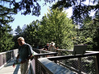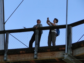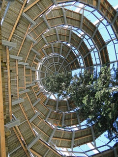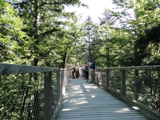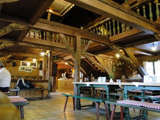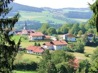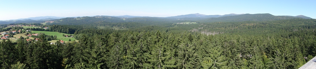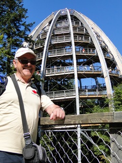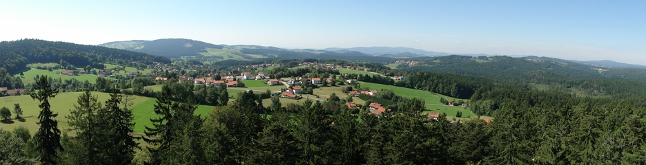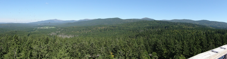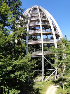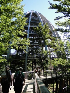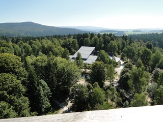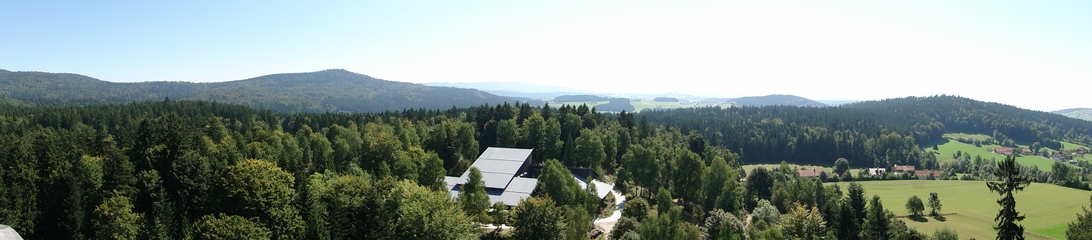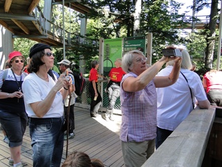 Und wieder ein Bonbon! Über Grafenau geht es nun in den dichten Wald hinauf nach Neuschönau. In Europas größtem zusammenhängendem Waldgebiet ist der Nationalpark am Lusen. Im Hans-Eisemann-Haus, benannt nach dem früheren Landwirtschaftsminister, wird sehr anschaulich und modern, mit allen neuen technischen Mitteln über die Entstehung und den Leitgedanken des Nationalparks, über Ökologie und weitere Naturthemen informiert. Allein da möchte man schon stundenlang verweilen. Für Kinder gibt es einen Naturerlebnisraum. In einem halbstündigen Film lernen wir den Wald mit ganz neuen Augen zu begreifen. Er zeigt uns vor allem, dass die Umwandlung von unserem anfälligen Fichtenwald zum ursprünglichen Naturwald gut möglich ist. Eine tolle Ergänzung zum Dreisesselvortag. Voll in der Natur erlebt man den Baumwipfelpfad. Er führt uns erst über einen langen Holzsteg in 20m Höhe durch Buchen, Tannen und Fichten. Tafeln erklären Leben und Lebensformen des Waldes. Ganz der Berliner Reichstagskuppel nachempfunden ist der 44 m hohe Baumturm. Natürlich offen und luftig. Über einen bequemen Holzweg winden wir uns spiralenförmig hinauf bis zu den Baumwipfeln. Kind und Kegel sind hier unterwegs. Von der obersten Plattform aus reicht der Blick ins weite offene Land im Westen und den dichten Bergwald im Osten hin zum Böhmerwald. Herausragend ist im Osten der Lusen mit seiner grauen Granitmütze. Im Südosten versteckt sich hinter dem Bergwald der Dreisessel. Am Ausgang des Pfades entpuppt sich die luftige Reichstagskuppel als fabelhaftes Ei. Eine regelrechte Wanderung war noch im Tierfreigelände angesagt. Auerhahn, Elch, Rabe und Wolf beobachten wir auf unserem 7 km langen Spaziergang. Furchterregend groß trotteten zwei Braunbären durch ihr Gehege. Luchs, Biber und der Fischotter hatten sich leider versteckt. Nach diesem wieder so erlebnisreichen Tag fuhr uns dann Florian am