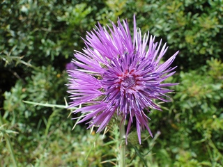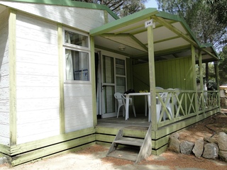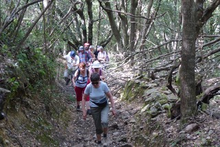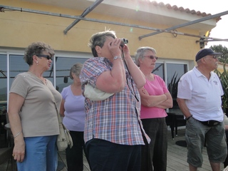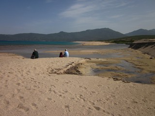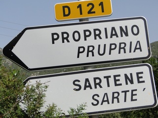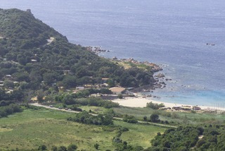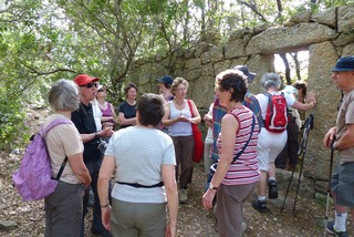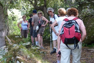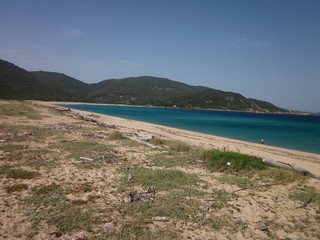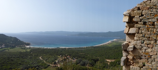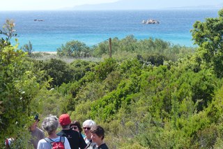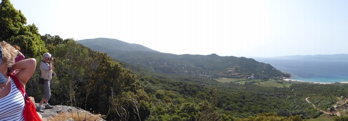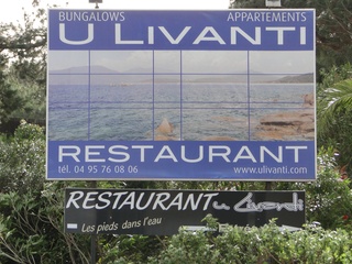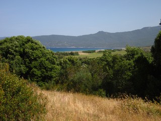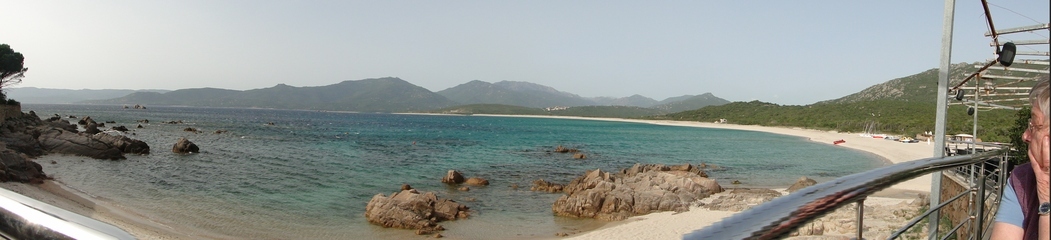 Kleine Ferienhausbungalows verstecken sich zwischen Kiefern in weitläufigem Gelände. Direkt an der Bucht liegt das Restaurant mit seiner Terrasse. Und so sitze ich nun und schaue den anderen bei der Morgengymnastik am Strand zu. Mitmachen kann ich nicht, denn schließlich muss ich ja endlich schreiben. Bei so vielen Eindrücken wird schnell vergessen was an den Vortagen lief. Der Ausblick von der Restaurantterrasse ist ein Traum. Man glaubt es kaum – vor uns die Bucht, die von einen kilometerlangen völlig unbebautem Sandstrand umrahmt wird. Auf einem Hügel dahinter liegt wie ein Platzdeckchen der kleinere Teil von Propriano, Petit Propriano. Der große Ort versteckt sich und so sieht man weiter bis in die hohen schroffen Berge. Ein Zaun trennt ein Naturschutzgebiet vom Strand. Eine Tafel zeigt uns, dass es hier endemische Pflanzen gibt. Der Sturm setzt heute den Wellen weiße Kronen auf. Von tiefblau bis hellgrün leuchtet das Wasser. In einem kleinen Tümpel quaken Frösche. Schilf biegt sich bis zur Querlage im Wind. Als wir am Ende des Sandstrands zur Einmündung des Flüsschens Rizzanese kommen hat sich der Wind in einen veritablen Sandsturm hochgearbeitet. Fegt über den Strand und bläst uns den Sand in die Schuhe. Der Himmel ist wie im Saharasandsturm milchig und von dort kommt wohl auch noch Sand herangeweht. Korsikas Strände sind rau wie das Gebirge. Nur feiner Kies, kein feiner Sand. Gut für die Fußsohlen. Aber am Ende waren wir müde wie nach einer guten Wanderung . Gerti Plangger