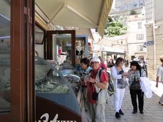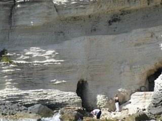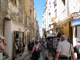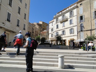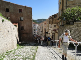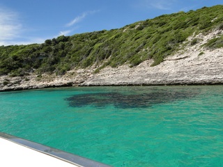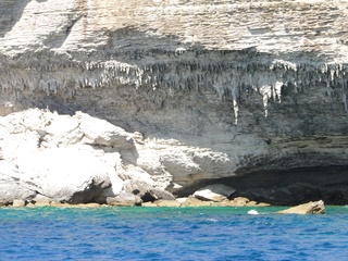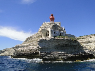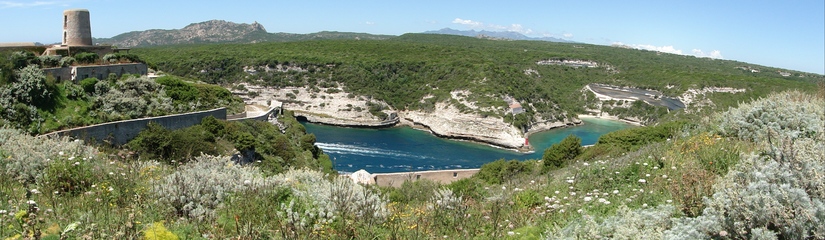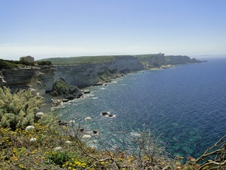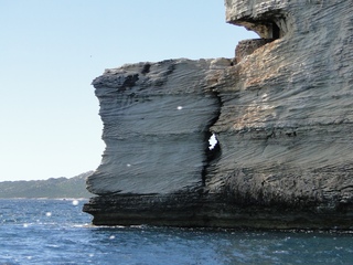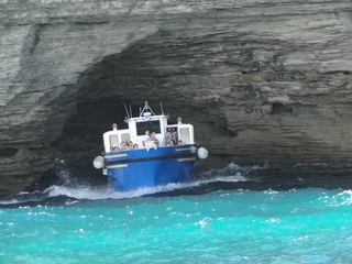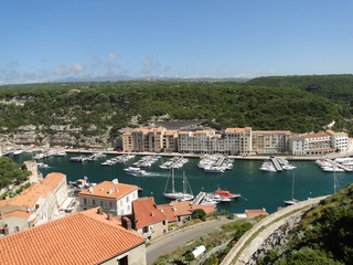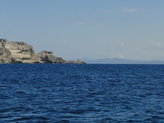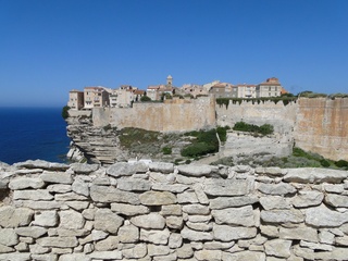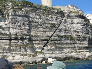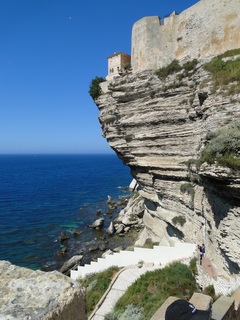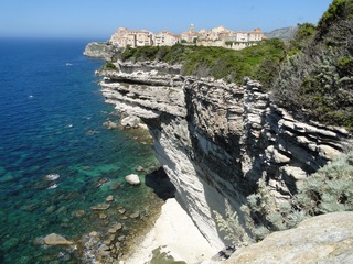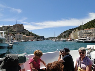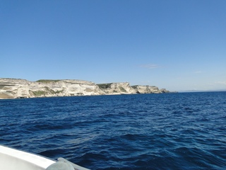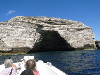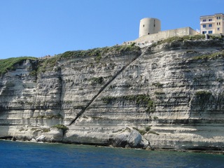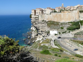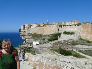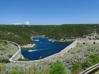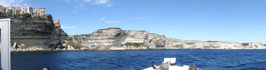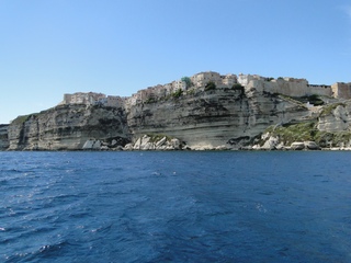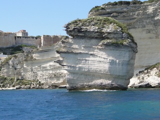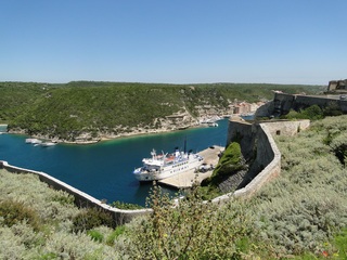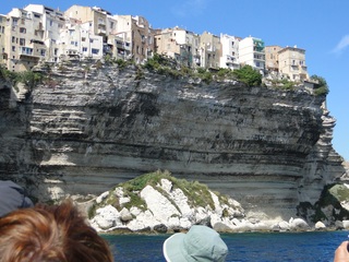 Wir schlängeln uns wie bereits gewohnt hügelauf, hügelab auf guter Straße durch die Landschaft in Richtung Bonifacio. Unten im Tal machen die Wiesen den Reben Platz. Wie ein unbetretener Bouclèteppich bedeckt die Macchia die Hügel. Ein glänzendes Grün an dem man sich einfach nicht satt sehen kann. Ab und zu zwängt sich wie ein Schmutzfleck ein Felsbrocken dazwischen. Korkeichen und Steineichen recken sich aus dem Gewebe. Wieder oben halten wir gegenüber des Rocher du Lion – dem Felsenlöwen, der über die Bucht wacht. Nach 1 ½ Stunden erreichen wir Bonifacio. Und es ist wieder gigantisch. Auf einer weit ins Meer ragenden Kalksteinklippe, schmal wie eine Zunge, hat sich die Altstadt angesiedelt. Am Hafen vorbei und durch die Unterstadt kommen wir zur Treppe Montée Rastello, die es zu erklimmen gilt. Wir wandern nach links weiter hoch zum Hügel gegenüber der Altstadt. Und von dort bietet sich uns ein atemberaubender Anblick: Das äußere Ufer der ist derart ausgewaschen, dass die Häuser der Altstadt wie auf einem Balkon stehen. Man kann nur hoffen, dass das nicht eines Tages herunter kracht. Von den Kalksteinklippen entlang nach Südosten hat man den Blick zur Altstadt. In der Ferne, am südlichsten Punkt Korsikas, dem Cap Pertusato sehen wir einen Genueserturm und dahinter dann, schließlich ist es nur 18 km entfernt – Sardinien. Dann steigen wir die letzten Stufen hoch in die Altstadt die von einer mehr als 2 ½ Kilometerlangen Befestigungsmauer umgeben ist. Über eine alte Zugbrücke kommt man zum Port de Genes. Mittelalterlich und reichlich zerfallen ist es hier. Enge, kopfsteingepflasterte Straßen werden von vier bis fünfstöckigen Häusern gesäumt. Den weit größten Teil dieser Felsenklippe nimmt jedoch weiter im Westen die verlassene Zitadelle an. Sie war lange der Stützpunkt der französischen Fremdenlegionäre. Ganz am Ende dieser Klippenzunge liegt noch der Seefahrerfriedhof. Pompöse Familiengruften und einfache Gräber sind sehenswert. Wir steigen über steile Treppen an der Nordseite wieder hinab in die Unterstadt. Der Hafen und die Unterstadt liegen am Ende des kleinen Fjords. Um15.00 Uhr beginnt unsere Bootsfahrt. Links oben die Altstadt. Von zwei mächtigen Türmen führt je eine Treppe hoch zur Festung. Rechts kommen wir an zwei kleine verträumten Buchten vorbei. Am Fjordausgang wacht ein Leuchtturm. Ganz oben steht La Madonetta und beschützt die Seefahrer. Dicht gleitet das Boot an dem Steilufer entlang. Wie ein feines Blätterteiggebäck liegen die Kreideschichten aufeinander. Soeben kommt aus einer Grotte ein Boot. Wir umfahren die Landzunge. In die Grotte Sdragonatu fällt durch einen Spalt Sonnenlicht – die schmale Öffnung ist laut Bootsführer wie Korsika geformt. Geradezu aberwitzig führt an der senkrechten Seeseite wie ein dünner Strich in die Steilwand gezogen, eine Treppe hoch, die man dem König von Aragon widmete. Und wir konnten tatsächlich verwegene Touristen steigen sehen. Gerti Plangger