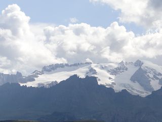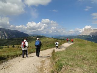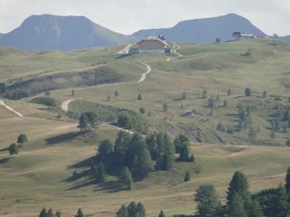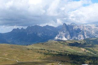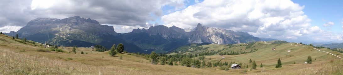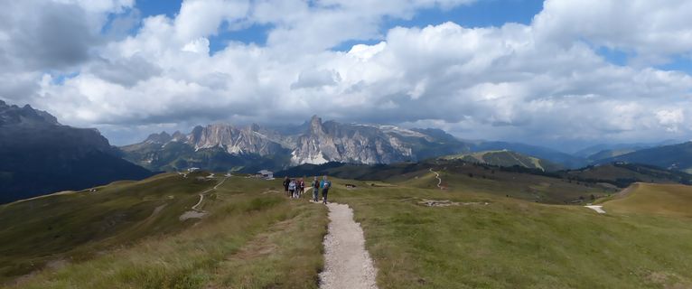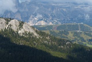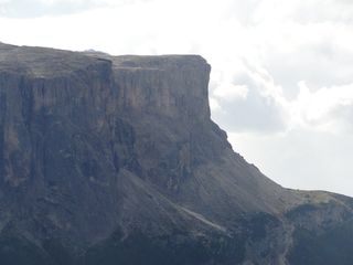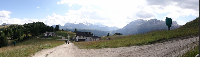 der Sella, in der Ferne die schneebedeckte Marmolada. Im Tal dann noch