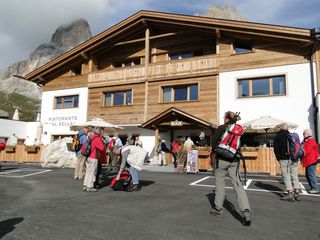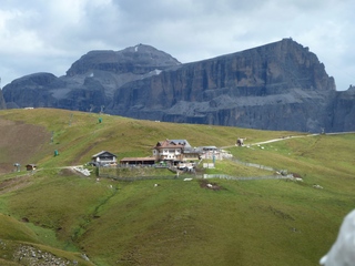 großes Hotel und kein Busparkplatz erwarten uns am Sellajoch.