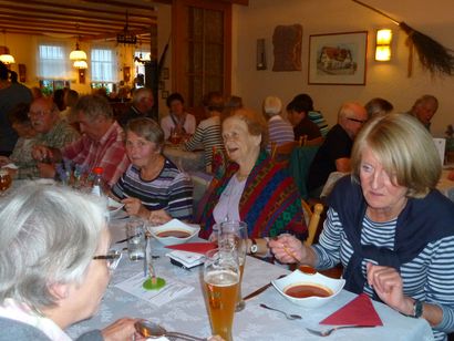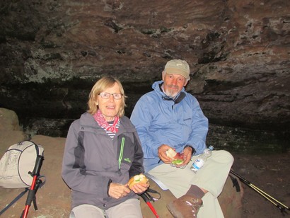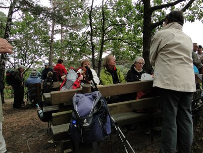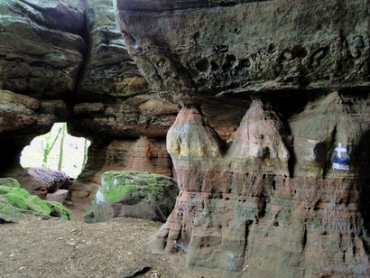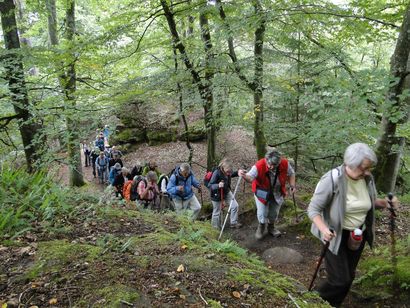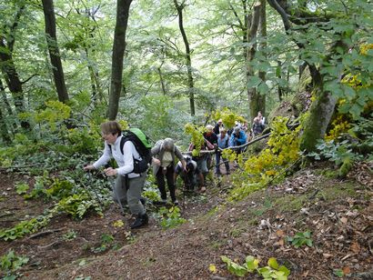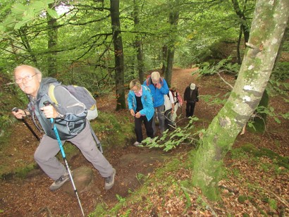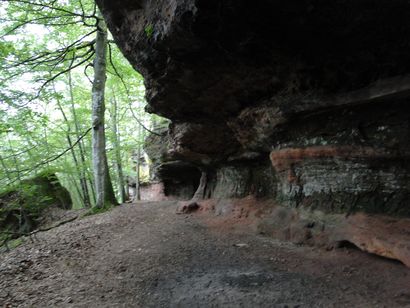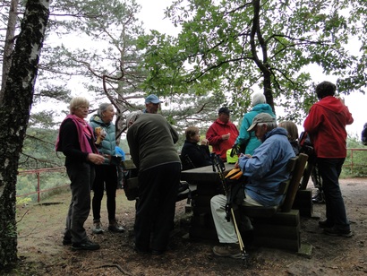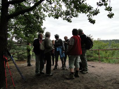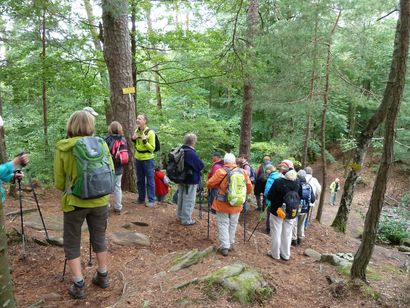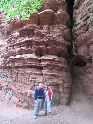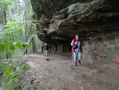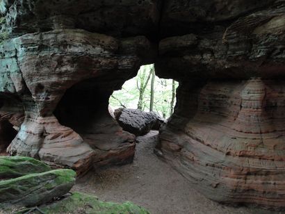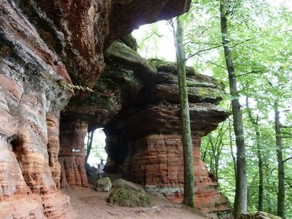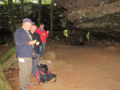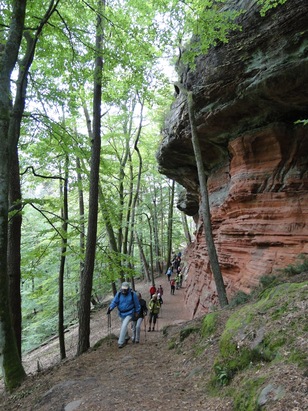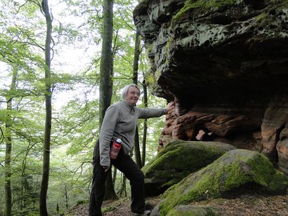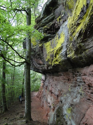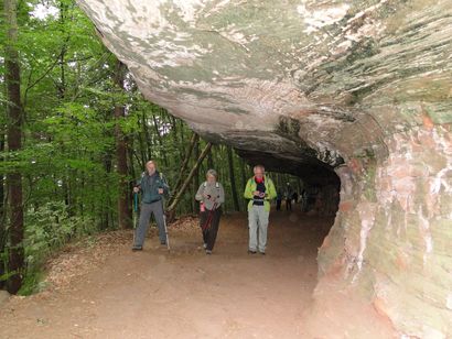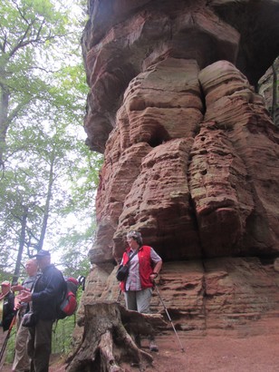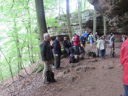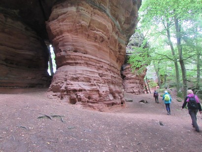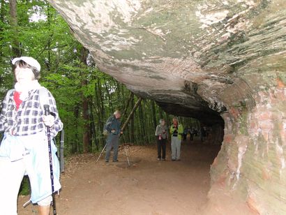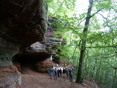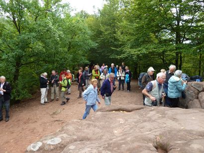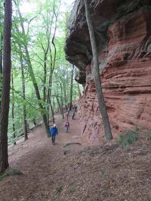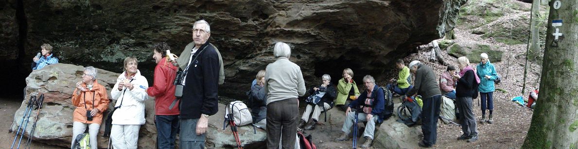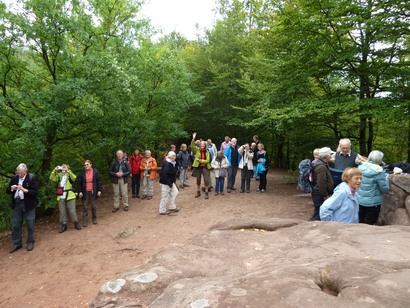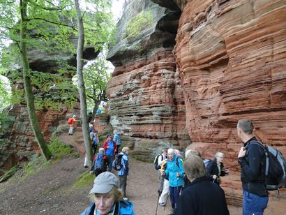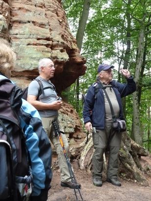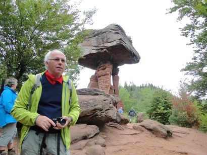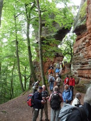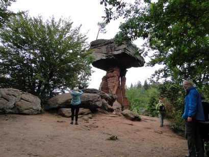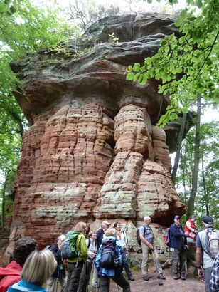 Pfälzer Wald. Fast unheimlich ist die Fahrt durch die engen Täler. Dicht bewaldete Berge aus denen immer wieder rote Sandsteinfelsen hervorschimmern. Die Altschlossfelsen bei Eppenbrunnen sind eine etwa 1,5 Kilometer lange Felsgruppe aus Buntsandstein, deren Türme eine Höhe von bis zu 30 Metern erreichen. Teils haben sich einzelne Sandsteintürme ausgebildet, teils längere Ketten. Sie sind von Rissen und Fugen durchzogen, die teilweise sogar breit genug sind um hindurchzusteigen. Sie sind vor allem durch ihre vielfältigen Verwitterungserscheinungen und durch seltene Flechten bekannt. An einer Stelle können die Steine über einen schmalen Pfad bestiegen werden. Auf dem Gipfelplateau findet sich ein lichter Wald, sowie mit Moos bewachsene Steine. Rote, quergeschichtete Sandsteinfelsen, erodiert in teilweise große Überhänge, die wir in der Wüste Abri nennen. Sie laden auch hier zum Übernachten ein. Ich möchte wetten, dass in der Urzeit hier nichts bewaldet war. Zu sehr ähnelt es dem Tassilli N'Ajer in der Sahara. Manfred hat unsere Route so ausgewählt, dass wir erst oben entlang durch die Laubwälder gingen. Da blickte man in die Abgründe. Danach umrundeten wir das Gebiet auf der unteren Seite und das war mit den grünen pilz – und flechtenüberzogenen Wänden geradezu spektakulär. 2 Stunden später winkt dann schon das Pfälzer Wahrzeichen – der Teufelstisch. Steht wie ein freier Pilz in der Landschaft. Hier tummeln sich die Massen, denn er ist leicht erreichbar und an seinem Fuß ist auch ein gutes Restaurant, das uns noch eine kleine Einkehr beschert. Gerti Plangger |