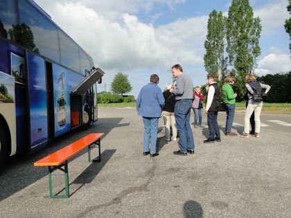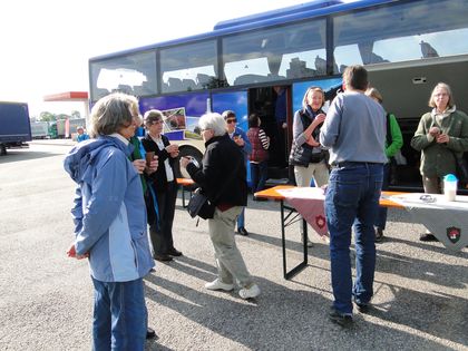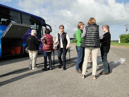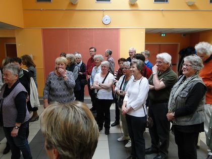 Wenn Engel reisen stimmt der Wetterbericht eben nicht. So was von entspannt und obendrein nix vom angeblichen Regen. Um acht Uhr, wie immer, ab Bissierstraße. An den Hängen der Autobahn, ganz so als schlüpften wir durch eine lange goldene Gasse aus Ginster kommen wir vorbei an Belfort. Dann nahm Markus, unser Busfahrer die D 9 Landstraße Richtung Vesoul. Und so zotteln gemütlich durch Wiesen und Laubwälder. Grün mit gelben Flecken streichelt sanft die Seele. Stundenlang. Als würden wir von der goldenen Gasse auf einen weichen grünen Teppich geschoben. Wie dünn ist doch dieses Land besiedelt. Nur ab und zu lugt ein typischer Franche Comtè Clocher aus der Landschaft. In der Haute Marne bei Langres aber stechen die Kirchtürme spitz in den Himmel. Ab Chaumont gibt’s wieder Autobahn, der Traum ist vorbei und bald ist alles dichter besiedelt. Bis schließlich gegen vier der Tower von Orly zu uns winkt. Und schon sind wir am B&B Hotel in Chevilly Larue. Winkend kommt uns Guy entgegen. Wenig später dann, kommen die herzlichen Umarmungen Hochdorfs RSCL Freunde. Küsschen, Küsschen, man kennt sich ja schon bevor Hochdorf Freiburg zugeschanzt wurde. Das Komitee wird vorgestellt. Ingeborg, eine Deutsche, die seit 40 Jahren in Frankreich lebt, übersetzt für uns. Die meisten von uns können aber auch von „le boeuf - der Ochs, la vache – die Kuh, fermez la porte – die Tür mach' zu, aufwärts bis hin zu Gerlindes elegantem Französisch, ganz nett parlieren. So ist die Verständigung kein besonderes Problem. RSCL steht für Retrait Sportiv Chevilly Larue einer in Frankreich sehr üblichen Einrichtung. Dann gab es ein so reichliches Buffet, dass für das Abendessen beim Italiener unser Magen bereits besetzt war. Gerti Plangger