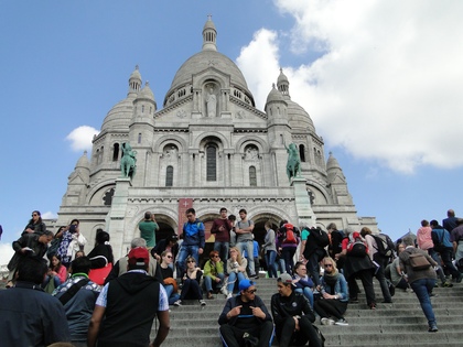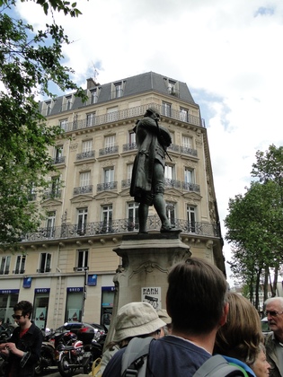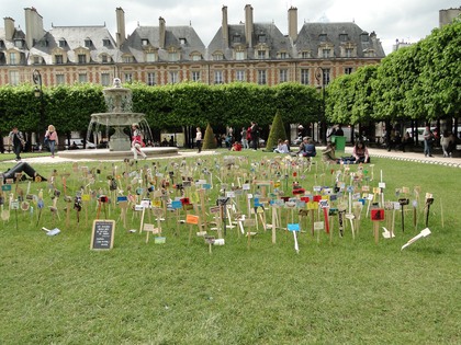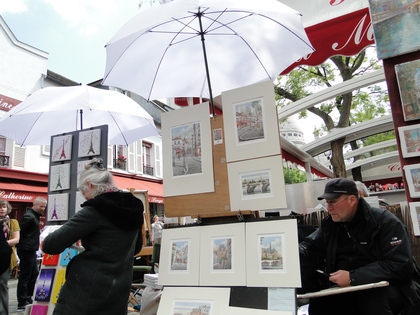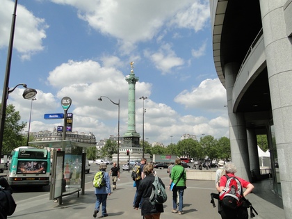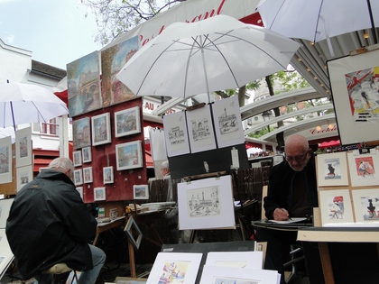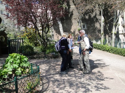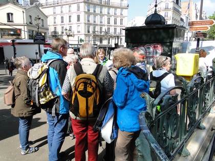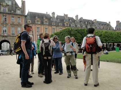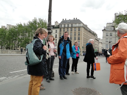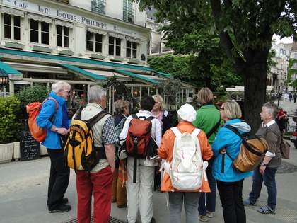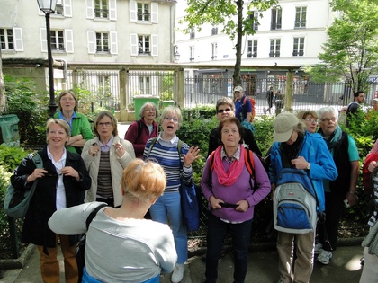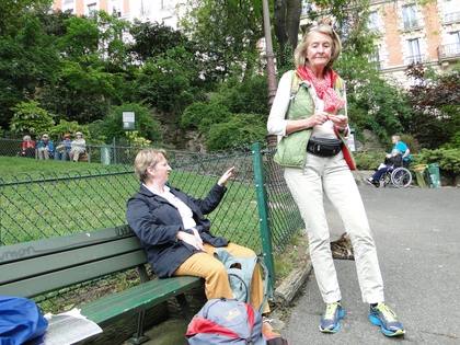 Paris erleben wir auf ganz besondere Weise. Mal ganz ohne die berühmten Hot Spots. Bus und Metro bringen uns zum Moulin Rouge. Janine und Ingeborg führen je überschaubare 12 Personen. Oben am Montmartre, dem höchsten Punkt der Stadt lugt schon eine alte Mühle zwischen Bäumen hervor. Hinter uns, hangabwärts blinkt die goldene Kuppel des Pantheons. Durch ein erlesenes Gourmetsträßchen steigen wir hoch zur Moulin de la Galette. Wobei Galette ja auch noch „Keksen“ meint. Unheimlich ist es auf dem kleinen Place Suzanne Buisson Man könnte erschrecken beim Anblick des Dichters …. wie hieß der noch? der mit halben Leib aus der hohen Mauer steigt. Spinnendürre lange Finger scheinen nach dem Betrachter zu greifen. Sein linkes Bein wagt einen Schritt aus der Wand, der rechte Arm ist zum freundlichen Gruß erhoben während der Kopf bedächtig vor sich hin sinnt. Am anderen Ende des Plätzchens hält ein Bischof seinen abgeschlagenen Kopf auf dem Arm. Nach so viel Schauder steigen wir weiter Richtung Montmartre. Wenn wir uns talwärts drehen bietet sich uns ein Häusermeer bis zum Horizont. Nur wenige Hochhäuser durchbrechen diese Linie. Man glaubt es kaum – an unserem Weg liegt in der Rue des Saules ein kleiner Weinberg. Aber dann geht es los – wir treffen auf den Touristenstrom und die lange Kette der Straßencafés. Ein Schelm, der Böses dabei denkt, was wäre der Montmartre ohne die pinselnden Maler. (Vielleicht sind sie bei der Stadt angestellt um das Flair zu erhalten). Nach einem kurzen Blick in die älteste Kirche St. Pierre de Montmartre mit ihrer Düsternis, steigen über die Rue Calvaire ab und stehen unten an den breiten Treppen zum Sacre Coeur. Ist auf den Stufen noch ein kleines Plätzchen frei? Fast nicht zu finden, steigen wir über eine ganz steile Treppe mit Baumstammimitationen weiter nach unten. Auf lauschigen Bänken verteilen wir uns zum Picknick. Per Metro zur Bastille. Und dann ins Marais. Einer der schönsten und ältesten Plätze von Paris, die Place des Vosges, liegt inmitten des Marais. Der Platz, der bis zur Revolution Place Royale hieß, wurde 1605 von Heinrich IV. an der Stelle eines Pferdemarktes angelegt. Victor Hugo wohnte hier im Haus Nr. 6 und Kardinal Richelieu im Haus Nr. 21. Durch einen breiten Torbogen schreiten wir auf den Place. Eine Oase mit Springbrunnen und passend zum Quadrat des Platzes mit exakt geschnittenen Bäumen. Wo früher die eleganten Damen flanierten haben sich heute Jung und etwas Ältere niedergelassen haben. Natürlich sind Picknick und Selfies angesagt. Mit beigem Zylinder, Jasmin im Knopfloch und wächsernem Gesicht führt ein Herr aus der Belle Epoque eine Gruppe Touristen durch den Park. Welch krasser Gegensatz in Kleidung! Unser weiterer Weg führt uns ins Marais, Der Marais ist ein besonderes und sehr ursprüngliches Viertel von Paris. Es hat die Haussmannschen Modernisierungsbestrebungen des 19. Jahrhunderts überstanden, wodurch die ältesten und prachtvollsten Hôtels particuliers, d. h. Stadtpaläste des Adels, neben den windschiefen Häusern der Handwerker, die hohen Mietshäuser neben den Ordensniederlassungen der Tempelritter hier überlebt haben. . Der Marais (frz. Le Marais, deutsch Morast, Sumpf) ist ein Stadtteil (frz. quartier) von Paris am rechten, dem nördlichen Ufer der Seine, östlich von Beaubourg, zwischen der Place de la République und der Place de la Bastille. Er gehört sowohl zum 3. als auch zum 4. Arrondissemen Hier fällt uns starke Polizeipräsenz auf. Aber auch ab und zu orthodoxe Juden mit Löckchen und Zylinder. In hebräischer Schrift werden die eigentlich orientalischen Falafel angeboten. Am Seineufer haben die meisten Bouquinisten ihre grünen Stände zugeklappt. So gönnten uns noch in einem Cafe am Seineufer ein Päuschen. Und wenn man schon Notre Dame ziemlich nahe sieht sollte man dort auch noch vorbei schauen. Gerti Plangger