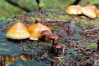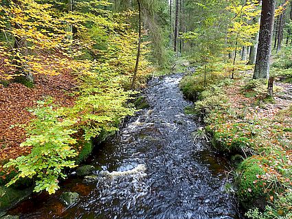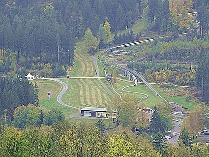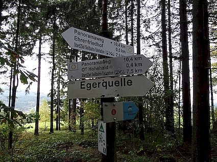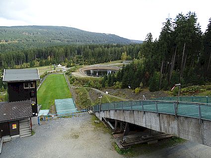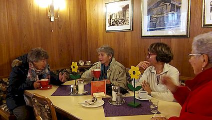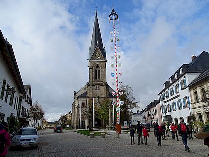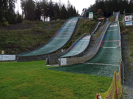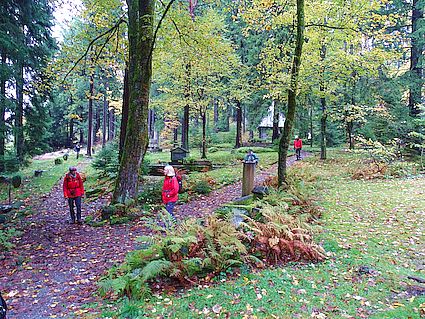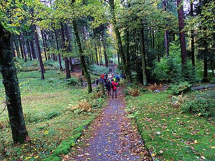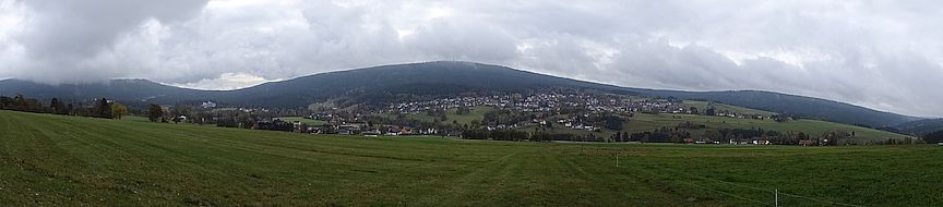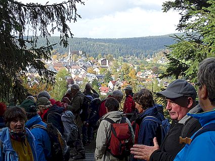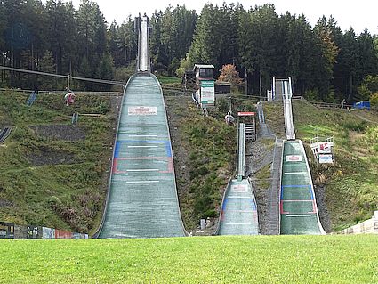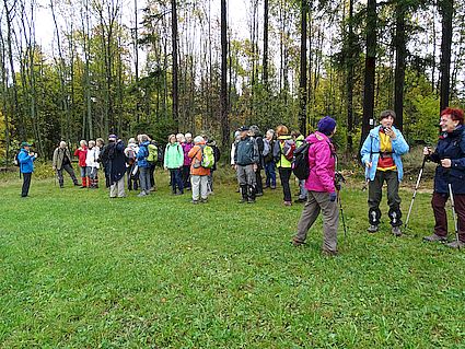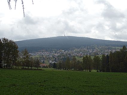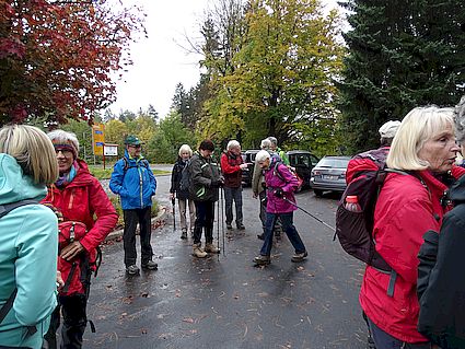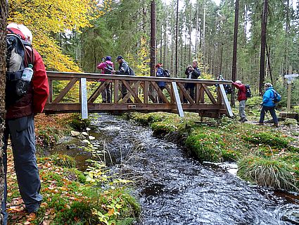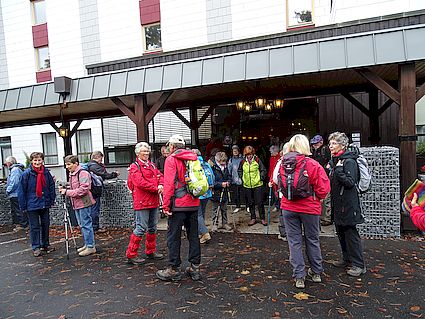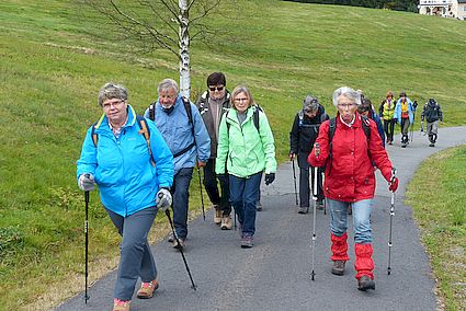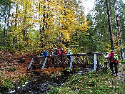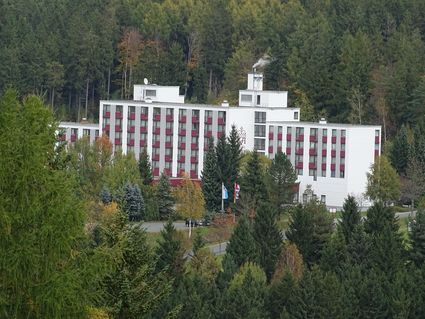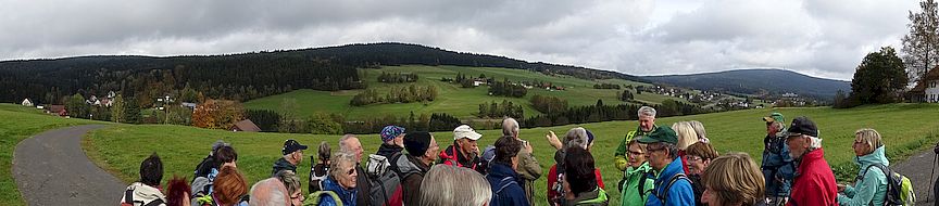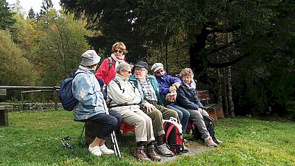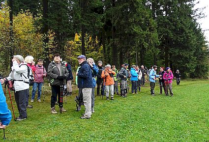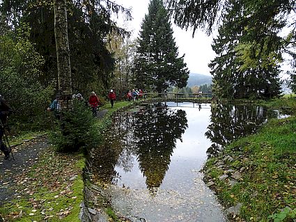 Nur ganz zögerlich hebt sich der Nebelschleier und zeigt uns die Tannenspitzen über Bischofsgrün. Sie winden sich wie ein Kranz um das Dorf am Hang. Panoramawanderung rundum ist für heute angesagt. Da brauchen wir ja nur die Sicht nach unten. Doch bald schon recken sich der Ochskopfsendemast und der Schneebergturm, das „Backöfele“ aus dem Nebel. Wir steigen kurz bergan kommen in einen romantischen Park mit kleinen Teichen und Gedenktafeln der Kriege. Es ist der Ehrenfriedhof. Dann erzählt uns Manfred Erstaunliches: Das Fichtelgebirge sendet im Umkreis von 20 km vier Flüsse als Boten in alle Winde. Die Saale entspringt am Schneeberg, fließt in die Elbe ebenso die Eger. Die will aber erst durch Tschechien. Die Naab gibt ihr Wasser zur Donau und wo Weißer und Roter Main hinfliesen wissen wir eh alle. Wie eine dünne Nadel sticht nun der Sendemast des Ochsenkopfturms nebelfrei in den Himmel. Auf wurzeligen Waldwegen drehen wir weiter unsere Runde, sehen die vielen Gasthäuser im Luftkurort und ziehen hinauf zur Sprungschanze. Nach diesem Highlight des Orts steuern wir bergab dem Hotel zu. Praktisch, dass sich einige müde Füße zuvor beim Kurhaus in den Bus setzen konnten. Nach unserem köstlichen Abendessen gab es noch einen weiteren Leckerbissen.