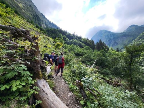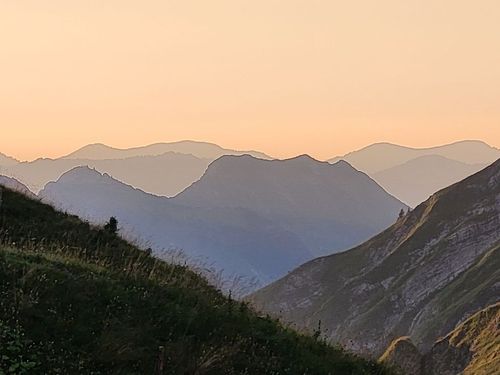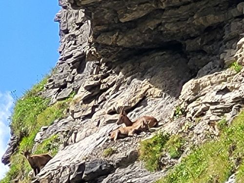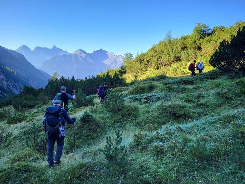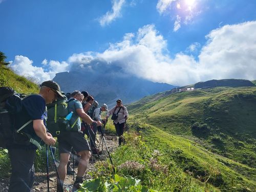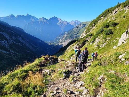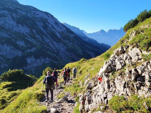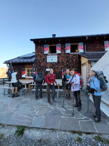 Hier ist die Landschaft noch erstaunlich grün und wir haben gutes Wetter. Unsere Wanderung startet in der Spielmannsau mit einem Aufstieg von 850 Höhenmetern durch den wilden Sperrbachtobel zur Kemptner Hütte (1.846 m). Die Wegstrecke ist nur 6 km lang und der Weg steinig. Unterwegs kommen wir an der schönen Kapelle am Knie vorbei und Jaschar erzählt uns eine Geschichte dazu. Nach kurzer Rast geht’s weiter aufwärts auf schmalem Stieg. Plötzlich Steinschlag von oben. Wir drücken uns an den Hang. Dann geht’s weiter. Wir schauen später zurück und sehen die Verursacher. Es waren junge Steinböcke, die auf einem Überhang die Steine losgetreten haben. Zum Glück ist uns nichts passiert. Die Kulisse der Alpen ist großartig. Wir erreichen um 17 Uhr die Hütte und bekommen zwei Mehrbettzimmer für die Nacht. Die Hütte ist eine Alpenvereinshütte der Sektion Allgäu Kempten und hat 290 Übernachtungsmöglichkeiten, keine Dusche und nur kaltes Wasser. Die Hütte ist gut belegt. Wir erleben eine schöne Abendstimmung und eine ruhige Nacht. |