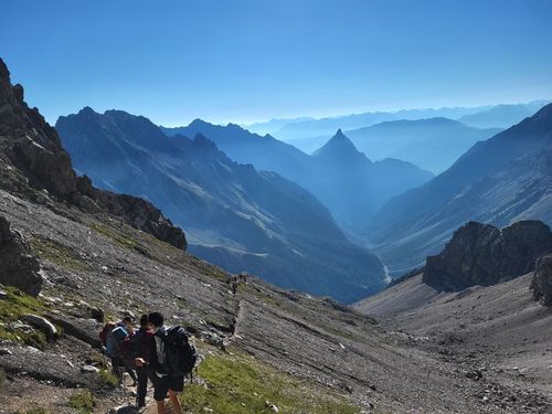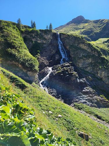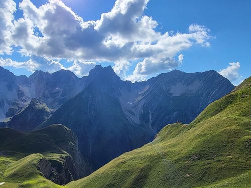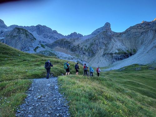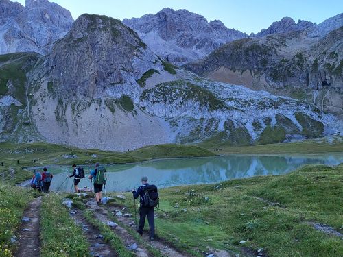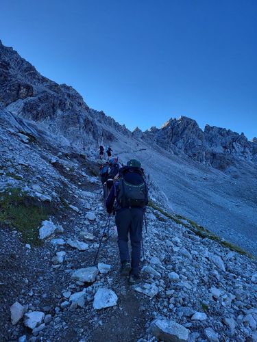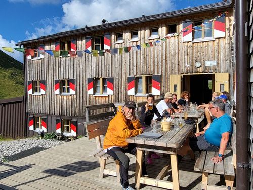 Von hier nehmen wir einen Busshuttle und fahren in das Madautal. Es ist eine abenteuerliche Fahrt auf schmaler Straße und wir sind froh, dass wir uns die 15 km Teer und Schotter sparen. Bei der Materialseilbahn können wir unsere Rucksäcke aufgeben und den Aufstieg mit leichtem Gepäck zur Memminger Hütte (2.242 m) machen. Es sind wieder circa 850 Höhenmeter zu bezwingen. Doch wir haben gutes Wetter, wunderschöne Berge und einen schönen Wasserfall bis wir oben ankommen. Die Memminger Hütte ist die Alpenvereinshütte der Sektion Memmingen und liegt auf einem Hochtal mit dem Seewisee dahinter. Sie hat circa 150 Schlafplätze und ist voll belegt. Wir sind im Matratzenlager mit 86 Betten untergebracht und verbringen eine ruhige Nacht. |