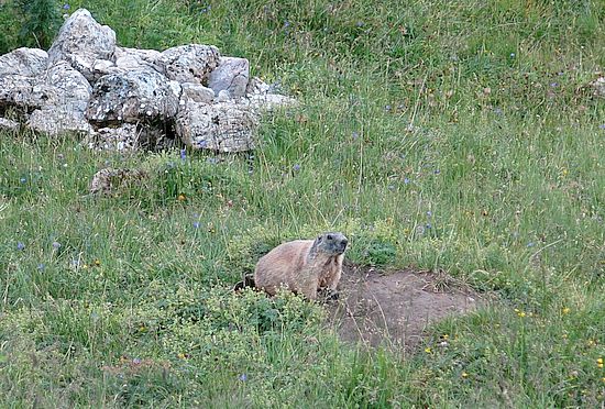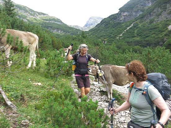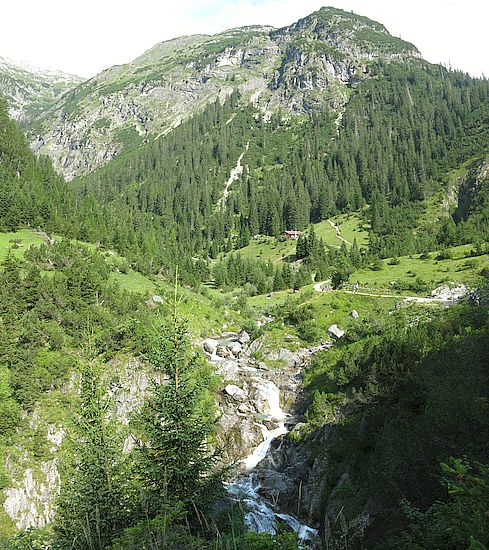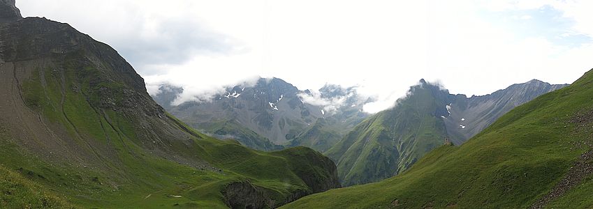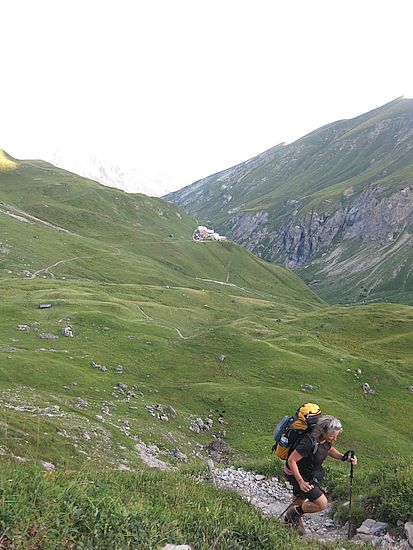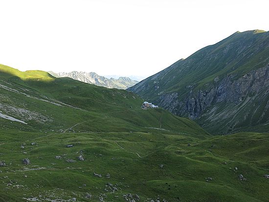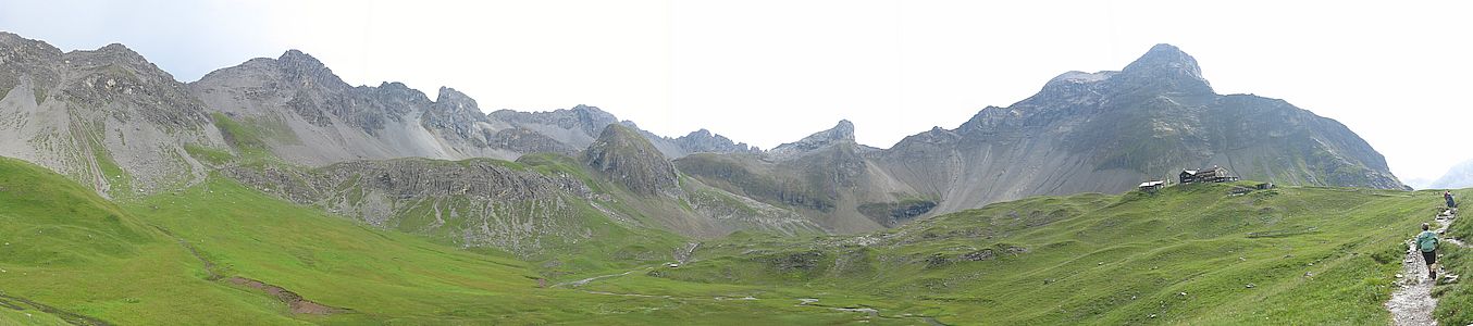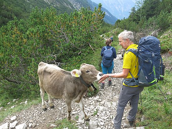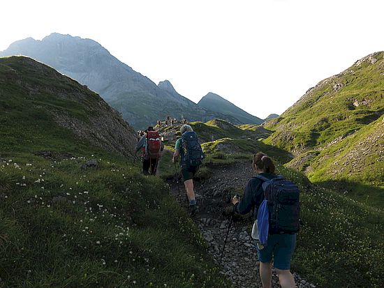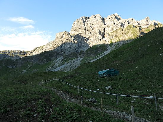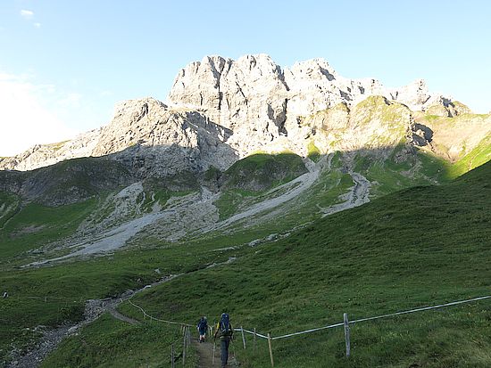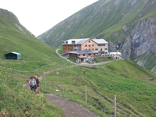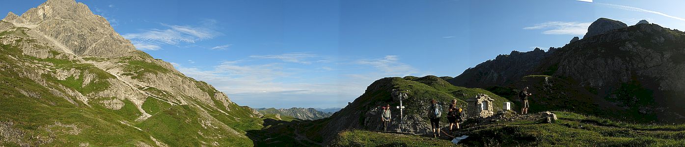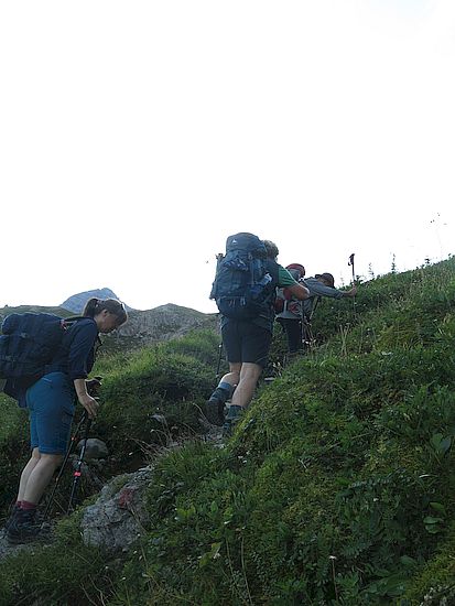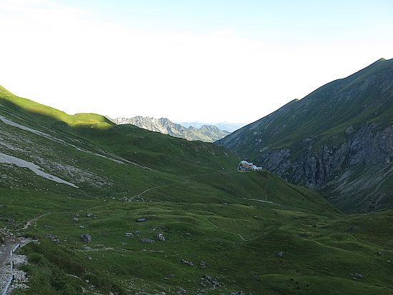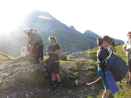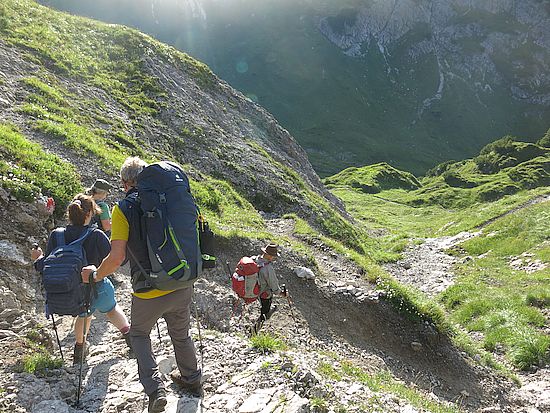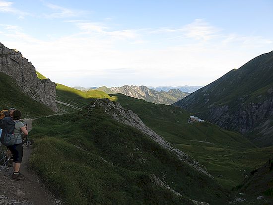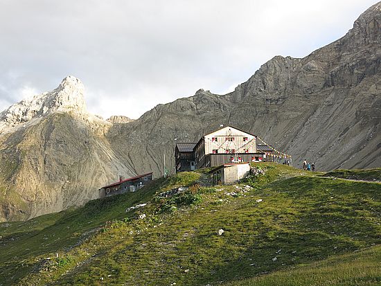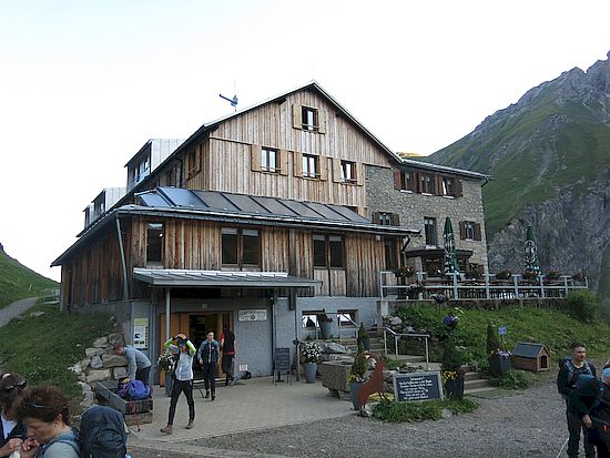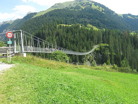 Aufstieg von der Kemptner Hütte zum Mädelejoch.(1974m) . Von dort Abstieg nach Holzgau im Lechtal- über die längste Hängeseilbrücke von Österreich(200,5 m lang). Von Holzgau ging es mit dem Taxi Feuerstein zum Parkplatz der Memminger Hütte, und von dort dann zur Materialseilbahn der Hütte und heute ein Aufstieg- ohne Rucksack- zur Memminger Hütte(2242m).Übernachtung auf der DAV-Hütte. | ![]() |