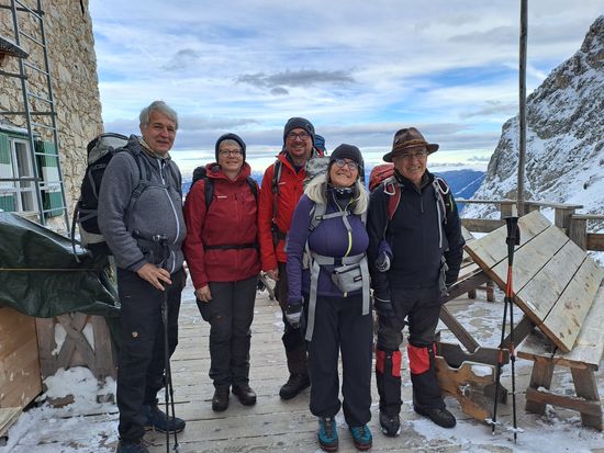 mit dem Hüttenwirt der Langkofelhütte und erfährt,